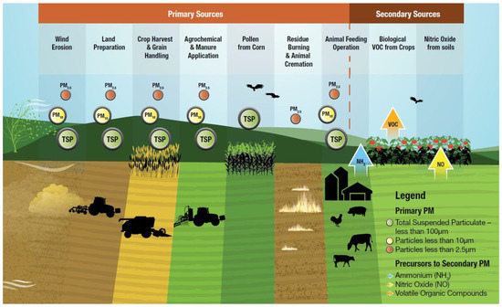 Major actions and factors affecting the emission of particulate matter (PM) from primary and secondary sources in agriculture. Source: [8].