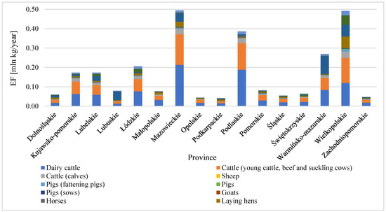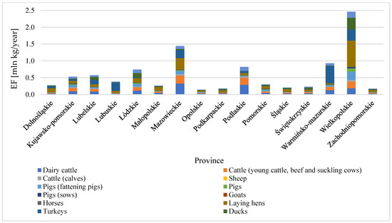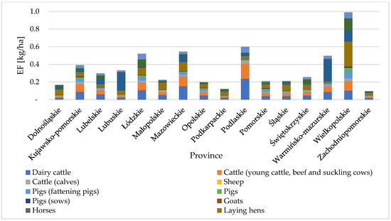 The data on the animal population across the provinces (an administrative unit) in Poland have been acquired from the Central Statistics Authority (GUS), the 2019 Local Data Bank [39]. While performing the research, it was the latest data available. A selection of the right method for estimating the emission of particulates from animal production, similarly as for the plant production and agricultural soils, must be made drawing on the EMEP/EEA annual guidelines [36]. Thus, the values of the EF coefficient for respective animal categories are given in Table 1.