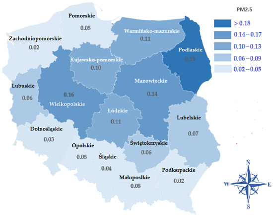 Concerning that approach, most PM2.5 was recorded for the Mazowieckie, Wielkopolskie, and Podlaskie provinces. The result was mostly due to the particulates from cattle farming. As for the PM10 particulate, the greatest size was reported in the Wielkopolskie and Mazowieckie provinces. The result was mostly due to the particulates from laying hen and turkey farming.