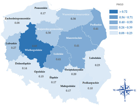 Level of PM10 pollution unit in the respective provinces (kg/ha). Source: Authors’ calculations based on [39].