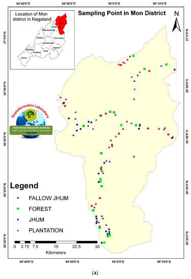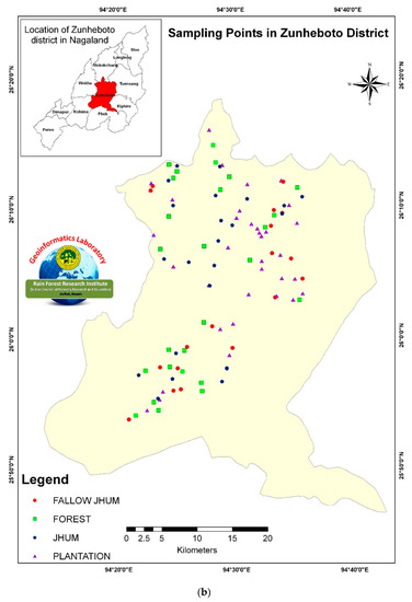 The northeast (NE) region of India is a biodiversity hotspot and is rich in flora and fauna [9]. Its physiographic position, with a favorable climate and healthy soils, provides suitable conditions for a luxuriant forest growth [10] that is typical of tropical areas, and for having a high biological richness, even on the steep slopes that characterize the region [11]. Forestry is the major land use pattern and covers around 65% of the geographical area in NE India, followed by agricultural land use (16%) [12]. About 86% of the total cultivated area of NE India is under jhum, also known as shifting cultivation, mainly practiced in the hilly areas [13,14]. Currently, jhum cultivation is practiced in 1.47 million ha of the area and serve as a major source of livelihood for 4.44 lakh (1 lakh is equal to one hundred thousand) jhumia families [15]. Jhum cultivation has evolved over millennia, through the knowledge of local peoples to manage the natural resources as a practice to cultivate crops or crop mixtures for household consumption for a couple of years, after slashing and burning a part of forest vegetation, without external inputs of nutrients and adopting minimum tillage operations. Jhum cultivation is also known to aggravate the issues related to soil health degradation, soil organic carbon (SOC) depletion and soil loss by erosion [16,17], due to continuous changes in land use from forest to jhum, jhum to fallow and secondary forest or jhum to plantations [17]. Other important land use changes in NE are the conversion of forests to plantations with profitable cash crops such as tea and rubber [18]. There are number of studies in Nagaland addressing various issues such as the relationship between tree diversity and soil properties [19], the assessment of soil quality in different land uses [20,21,22], the estimation of SOC stocks under different land uses [23], SOC stock mapping at the state level [24] and the dynamics of SOC under jhum and forests using the RothC model [25].