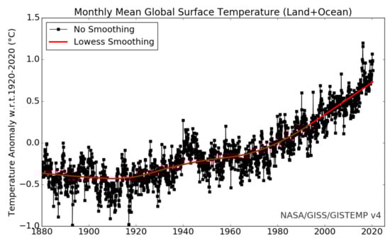 - Team, G. GISS Surface Temperature Analysis (GISTEMP), Version 4; NASA Goddard Institute for Space Studies: New York, NY, USA, 2020. Available online: https://data.giss.nasa.gov/gistemp/ (accessed on 9 July 2020).