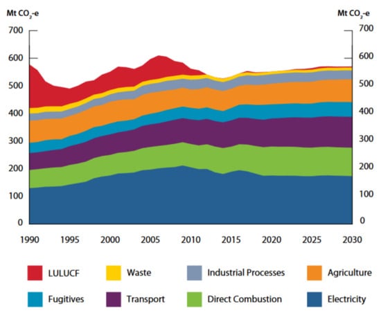 - Climate Council of Australia. Australia’s Rising Greenhouse Gas Emissions; Climate Council: Potts Point, Australia, 2018. [Google Scholar]