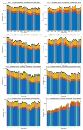 The potentiality of GHG mitigation by the contribution of the agriculture sector is less in developed countries, where this sector typically forms around of national GHG inventories [17,18]. However, there are some developed countries like Australia, where agriculture relatively plays a vital part in the national GHG emission profile. Agriculture is the second-largest source of GHG emissions in Australia, and it contributes of total GHG emissions. Hence, a focus on GHG reduction is a high priority [8]. Figure 4a–h shows the GHG emissions from the different agriculture sectors of the overall and various states in Australia. The primary GHG emissions from agricultural sectors consist of (a) methane from enteric fermentation, (b) carbon dioxide from decomposition of soil organic carbon, and (c) nitrous oxide from manure and synthetic fertilizer.