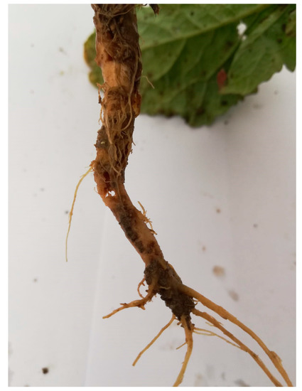 Resistance to two insects, Delia radicum and Brevicoryne brassicae, was assessed during field trials. The assessment of general damage caused by D. radicum and B. brassicae infestation was performed in 2017, 2018, and 2019. The evaluation of direct damage on roots for D. radicum, and the percentage of infested plants by B. brassicae was executed according to the European and Mediterranean Plant Protection Organization (EPPO) standards [19] on randomly chosen individuals (Figure 1 and Figure 2). For every genotype, ten plants were assessed in each replication. The severity of insect damage and plant infestation were evaluated at physiological maturity on a one to nine scoring scale, used commonly by the Research Center for Cultivar Testing in Poland, which corresponds to the International Union for the Protection of New Varieties of Plants [20] system of assessment. According to this scale, for D. radicum, a score of nine means no visible damage on plants (highly resistant), a score of five means that lesions are visible on up to 25% of the roots and surface of the leaves (moderately resistant), and a score of one means a completely damaged plant (fully susceptible). For B. brassicae, a score of nine means no insects present on the plant (highly resistant), a score of five means small and medium sized colonies on the plant (moderately resistant), and a score of one means that the plant is completely covered by aphid colonies (fully susceptible). The average values from ten plants were calculated for each replication, which allowed us to obtain quantitative traits data with the normal distributions.