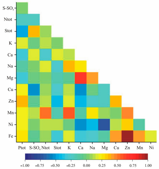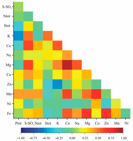 The correlation analysis within nutritional elements indicated statistically significant correlation coefficients for Zn and Fe, Mn and Fe, S-SO4 and Cu, Ntot and Mn, K and Na, Ca and Mg, Ca and Cu, Ca and Fe, and Na and Mg in both growth stages (Table 4, Figure 3 and Figure 4). Additionally, in the vegetation stage, we observed significant correlation between Ptot and Stot, Ptot and Zn, Stot and S-SO4, Stot and Zn, Stot and Fe, K and Mn, Ca and Zn, Ca and Ni, Na and Ni, Mg and Ni, Cu and Zn, Cu and Fe as well as Zn and Mn (Table 2, Figure 3). In the flowering stage, the pairs Ptot-K, Ptot-Mn, S-SO4-K, S-SO4-Ca, S-SO4-Mg, S-SO4-Mn, Ntot-Ca, Ntot-Fe, Stot-K, K-Ca, K-Mg, K-Zn, Ca-Na, Ca-Mn, Na-Fe, Mg-Cu, Mg-Mn, Mg-Fe, Cu-Mn and Cu-Ni were significantly correlated (Table 4, Figure 4).