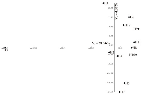 Individual nutrients are of different importance and have a different share in the joint multivariate variation. A study on the multivariate variation for hybrids also includes the identification of the most important mineral elements in the multivariate variation of hybrids. Analysis of canonical variables is a statistical tool making it possible to solve the problem of multivariate relationships [29,30,31,32]. Figure 5 and Figure 6 show the variability of the 13 nutrients of 12 studied rapeseed hybrids in the growth stages of the first two canonical variables in the first and second growth stage, respectively. In the graph, the coordinates of the point for particular hybrids are the values for the first and second canonical variables, respectively. The first two canonical variables accounted for 95.93% and 78.11% of the total multivariate variability between the individual hybrids in the vegetative stage and flowering stage, respectively (Table 5, Figure 5 and Figure 6). The most significant, negative, linear relationship between the first canonical variables was found for Zn and Fe in the vegetative stage (Table 5); the second canonical variable in the vegetative stage was significantly positively correlated with Ni and negatively correlated with Ca, Mg, and Mn (Table 5). In the flowering stage, the most significant, positive, linear relationship between the first canonical variables was found for Ntot, Ca, Mg, Mn, and Fe (Table 5). The second canonical variable in the flowering stage was significantly positively correlated with S-SO4, K, Ca, and Mg (Table 5). The greatest variation of all 13 nutrients jointly (measured Mahalanobis distances) was found for hybrids H3 and H9 (in vegetative stage) and H4 and H6 (in flowering stage), the Mahalanobis distance between them amounted to 232.13 and 86.35, respectively (Table 6). The greatest similarity was found for hybrids H8 and H11 (13.69) in the vegetative stage as well as between H1 and H5 (8.45) in the flowering stage (Table 6). The correlation coefficient between Mahalanobis distances in both terms was equal to −0.1606 and was not significant (p = 0.1977).