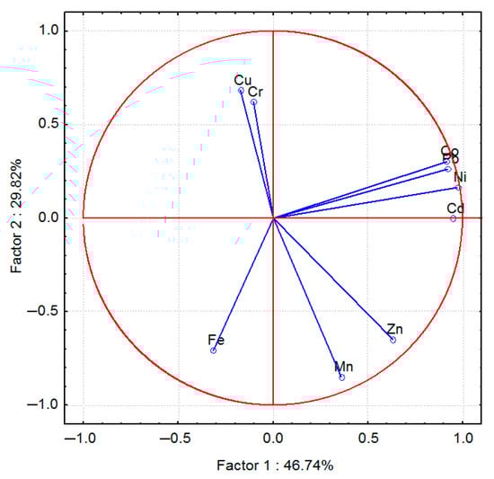Trace element content in maize (Zea mays L.) calculated using the principal component analysis (PCA) method. Vectors represent elements (Cd, Pb, Cr, Co, Ni, Zn, Cu, Mn, and Fe) as PCA results.