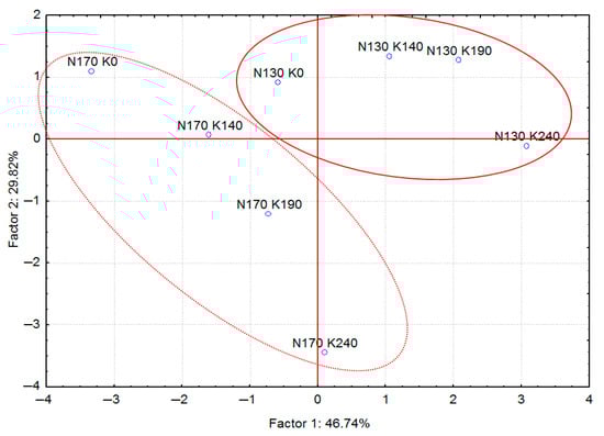 Impact of fertilization doses on trace element content in maize (Zea mays L.) calculated using the PCA method. Points show the content of all trace elements in plants (N 130—130 mg N per kg, N 170—170 mg N per kg; K0—0 mg K per kg (control), K140—140 mg K per kg, K190—190 mg K per kg, K240—240 mg K per kg of soil).