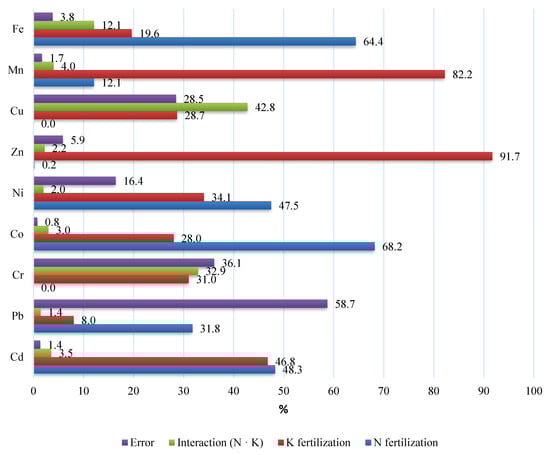 The observed variance ratio (calculated on the basis of coefficient η2, using the ANOVA method) showed no significant advantage of either potassium or nitrogen fertilization on trace element content in maize across both series and all pots (Figure 3). The distribution of the effect of potassium fertilization was highest for copper—28.7%, chromium—31.0%, manganese—82.2%, and zinc—91.7%, while it was also quite high for cobalt—28.0%, nickel—34.1%, and cadmium—46.8%. It should be noted, however, that the impact of nitrogen fertilization was stronger compared to potassium fertilization with regard to the levels of lead—31.8%, nickel—47.5%, cadmium—48.3%, iron—64.4%, and cobalt—68.2%. The impact of both fertilizers on the cadmium content of maize was similar.