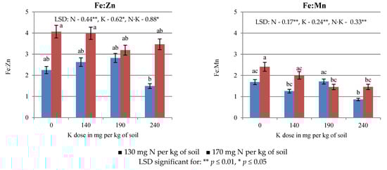 Fe:Zn and Fe:Mn ratios in the aerial parts of maize (Zea mays L.). Homogeneous groups denoted with letters a–c were calculated for the interaction between potassium dose and nitrogen dose.