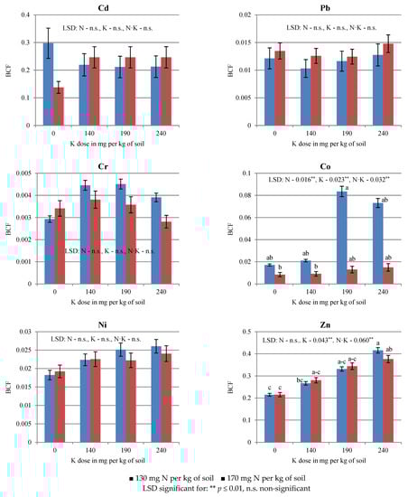 Bioconcentration factor (BCF) of cadmium, lead, chromium, cobalt, nickel, and zinc in the aerial parts of maize (Zea mays L.). Homogeneous groups denoted with letters a–c were calculated for the interaction between potassium dose and nitrogen dose.