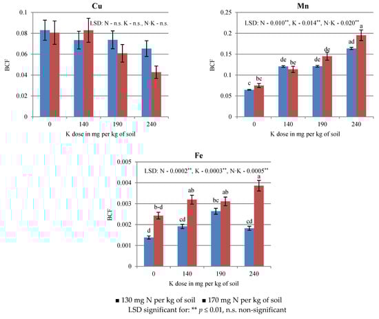 Bioconcentration factor (BCF) of copper, manganese, and iron in the aerial parts of maize (Zea mays L.). Homogeneous groups denoted with letters a–e were calculated for the interaction between potassium dose and nitrogen dose.