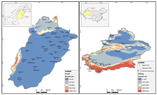 Location map of the study areas of Xinjiang province in China, and Punjab province in Pakistan on the basis of topographic elevation.