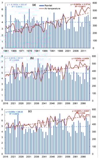 Quantification of climate warming trends (a) during the observed years, and two future scenarios: (b) RCP4.5, and (c) RCP8.5 for annual mean daily air temperature and annual rainfall in Punjab, values of R2 in red indicate significance at p < 0.01. Intercepts represent the value during the first year of the time series, i.e., in figure (a) x = 1961 and in (b) x = 2016, and (c) x = 2016. The yearly variation is represented in the slopes (where p = 0.43).
