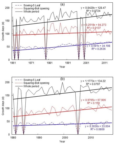 Simulated rends of (a) three simulated phenological growth stages of cotton from 1961–2015 in Punjab. Intercept values mentioned in the figure apply to the time of (growth days) sowing-five leaf stage, squaring to boll opening, and stop maturity in the starting year 1961. The variable x in the regression equations is calculated as x = year − 1961 (where p = 0.52); (b) three simulated phenological growth stages of cotton from 1980–2018 in Xinjiang. Intercept values mentioned in the figure apply to the time of (growth days) sowing-five leaf stage, squaring to boll opening, and stop maturity in the starting year 1981. The variable x in the regression equations is calculated as x = year − 1981 (where p = 0.18).