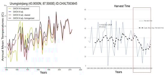 Further, the fiber quality anticipates the relationship between the plant’s fruit positioning architecture, air temperature, and agronomic practices, respectively [,,]. This study aimed to (1) quantify spatiotemporal changes in cotton phenology to climate change conditions in Xinjiang cotton zone, (2) observe the relations between climate change and the lengths of different cotton-growing periods and impact of crop yield, (3) identify significances in phenological differences and their implications for cotton production and adaptation to climate change in cotton zones. This research could provide the best climate-smart practices to cope with warming.