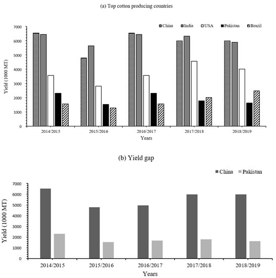 According to the comparative analysis of yield worldwide in recent years, cotton production in China reduced from 6532 (1000 MT) to 4790 MT in 2015/2016–2016/2017 and 2017/2018, and produced 5987 MT. In the meantime, cotton production in Pakistan declined from 2308 MT to 1676 MT, and yield significantly decreased up to 1633 MT during 2018/2019 in Xinjiang. Worldwide cotton outlook analysis (Figure 6) reported that the cotton production areas in Pakistan and China are equally increasing, but a significant yield decline was reported in Pakistan. The per hectare yield gap between China and Pakistan is around 1000 kg hectare−1. The future prediction of change in production in Pakistan and China might be −7.13 in Pakistan compared to China during 2019/2020. Likewise, the rising temperature also appeared to affect fiber length and quality as well.