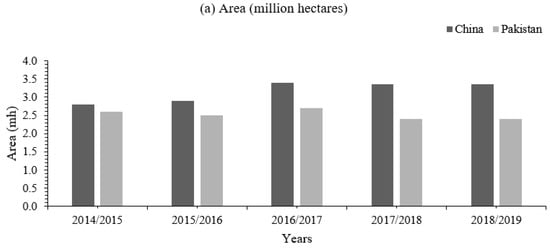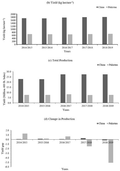 Yearly assessment of Pakistan and China (a) cotton production area (million hectares); (b) production (million bales); (c) yield (kg/hectare); (d) trends of change in production during growing seasons of 2015–2019, where 2018/2019 are predicted values on the basis of the previous data analysis.