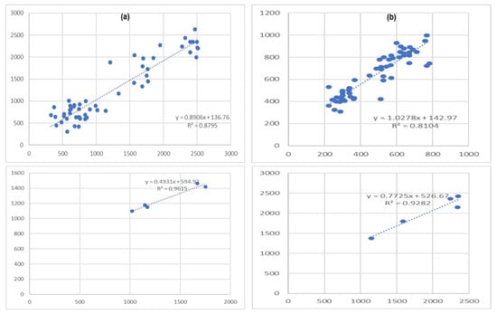 The present study also evaluated the performance of the APSIM-cotton model to quantify the long-term cotton-growth yield under different sowing windows. Long-term yield (kg/ha−1) quantification and model optimization of Xinjiang (1980–2018) and Punjab (1961–2015) cotton zones showed good agreement with observational data, both in calibration and validation (Figure 8). The NRMSE results of calibration for emergence, flowering, and maturity were 26.2%, 4.5% and 1.7%, respectively. The values of NRMSE validation were 21.3%, 7.2% and 5.8%, respectively. The APSIM-cotton model calibration and validation of cotton yield (kg/ha−1) under different sowing-dates presented a good performance with observed yields (NRMSE, 17.4%). For the years calibration of Punjab, the model projected yield also obtained a good result with an RMSE of 0.81 t ha−1 and an NRMSE of 14.9%. The findings of model calibration and validation of cotton total dry matter (kg/ha−1) under different sowing dates also showed variation among change in sowing time, influenced by climatic warming. APSIM-cotton quantification revealed that the sowing, emergence, flowering, and maturity stages were negatively correlated with temperature −2.03, −1.93, −1.09, and −0.42 days °C−1 on average, respectively. The comparison of the APSIM-cotton modelling results showed that climatic warming in Xinjiang, China also advanced the dates of seed drilling, drilling to seed emergence, three-leaf stage, five-leaf stage, budding, anthesis, full bloom, cleft-boll, boll-opening, and boll-opening filling, and further growth was stopped earlier than normal.