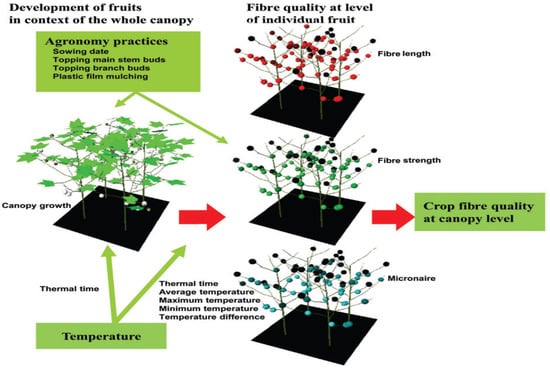 - Wang, X.; Zhang, L.; Evers, J.B.; Mao, L.; Wei, S.; Pan, X.; Zhao, X.; van der Werf, W.; Li, Z. Predicting the effects of environment and management on cotton fibre growth and quality: A functional-structural plant modelling approach. AoB Plants 2014, 6, plu040. [Google Scholar] [CrossRef]