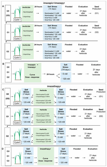 This research aimed to study the transgenerational effect of recurrent selection with combined salt stress and a sublethal dose of imidazolinone (imazapic + imazapyr or imazethapyr) herbicides on E. colona. We studied the effect of salt stress because, in some world regions, water or soil salinity is a problem in rice production fields.