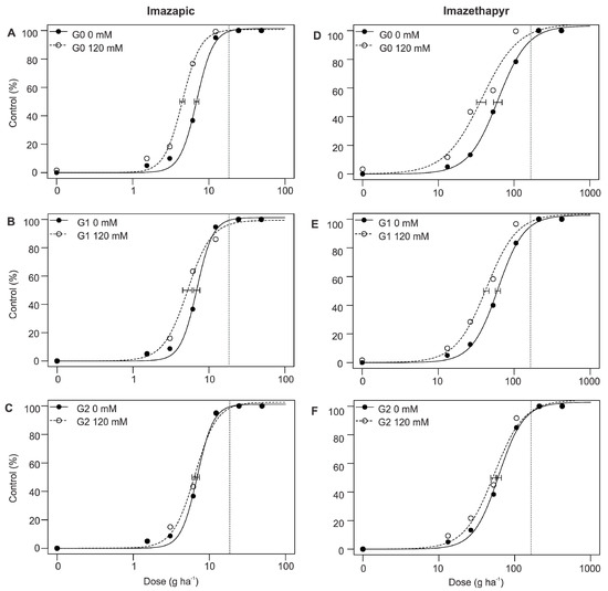 Nonlinear regression analysis of herbicide efficacy on Echinochloa colona as affected by cycles of recurrent exposure to salt stress and the sublethal dose of imidazolinone herbicides: response of E. colona from southern Brazil to imazapic (Kifix™, a formulated mixture of imazapic + imazapyr) in the parental population (G0) (A), G1 generation (B), and G2 generation (C). Also shown are the responses of E. colona from Arkansas, AR, USA to imazethapyr (Newpath™) of the parental population (G0) (D), G1 generation (E), and G2 generation (F). Circles (empty and filled) are the average of three replicates fitted with a three-parameter log-logistic model. Salt was applied at 120 mM. The vertical dotted gray lines indicate the recommended dose (g·ai·ha−1).