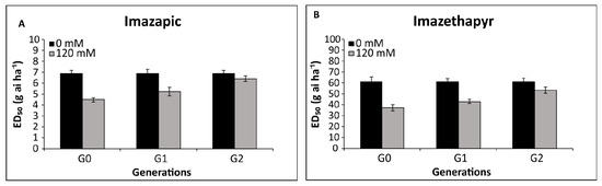 In general, the herbicide sensitivity profile was similar across experiments/herbicides. Treatments without salt stress showed no change in ED50 as the generations progressed (Table 2 and Figure 2A–F), with values of 6.92 (±0.23), 6.92 (±0.34), and 6.92 (±0.22) g·ai·ha−1 for imazapic in populations G0, G1, and G2, respectively. The ED50 values for imazethapyr were 61.41 (±3.90), 61.09 (±2.30), 61.35 (±2.62) g·ai·ha−1, in G0, G1, and G2, respectively. These average ED50 values correspond to approximately 0.28 and 0.29× the recommended dose of imazapic and imazethapyr, respectively, demonstrating that the sensitivity of junglerice did not change after three cycles of low-dose herbicide selection without salt stress.