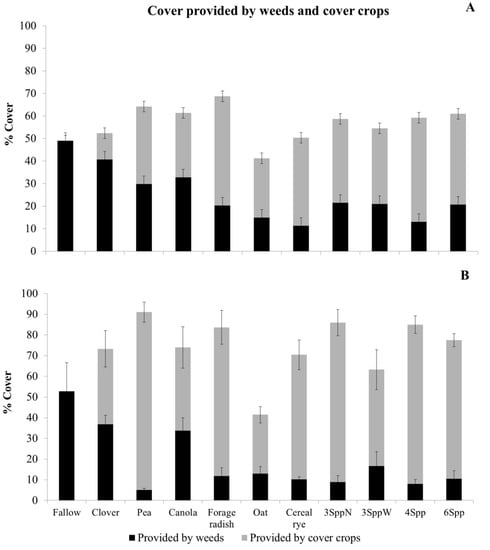 As primary producers, weeds also may be able to provide some of the same ecosystem services as those desired from cover crops. Even though the role of weeds within cash crops has been extensively examined and reviewed [15,18,43], little attention has been paid to the ecosystem service provisioning of weeds in cover crops. Most of the existing literature on this topic considers weeds as having an important role in providing food and habitats for wildlife and insects in agricultural landscapes [10,12,15]. Requier et al. [44] found that weeds growing in rapeseed (Brassica napus L.) and sunflower (Helianthus annuus L.) crops provided up to 40% of the honey bee diet between the mass flowering periods of those crops, thus playing a major role in pollinator conservation. Diehl et al. [9] also reported that compared with weed-free fields, weedy organic wheat (Triticum aestivum L.) fields supported a higher density and diversity of ground beetles (Coleoptera: Carabidae), many of which are important predators of insect pests and weed seeds. Increased populations of those predators can lead to reductions in yield losses due to insect pests [17].