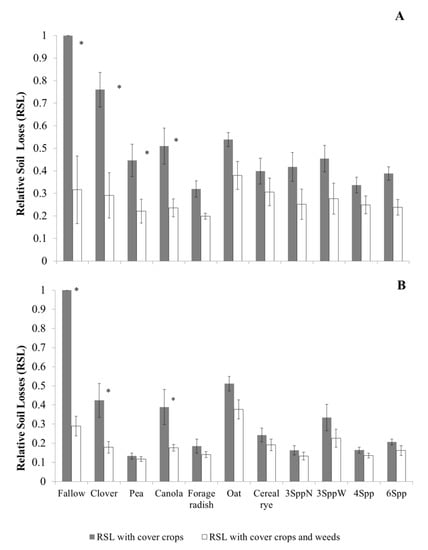 Figure 2. The additional cover provided by weeds significantly reduced the modelled relative soil losses (SLr, soil loss under a specific vegetation cover compared with the soil loss on a bare surface) in some cover crop treatments (white bars) compared with when cover was provided by cover crops alone (grey bars) in October (A) and November (B) of 2013 in a field experiment located in central Pennsylvania. Error lines correspond to ± standard error. The relative soil losses index ranges from 0 (100% cover, no soil losses) to 1 (bare ground, maximum soil losses). No cover crop was seeded in the fallow treatment. 3SppN: cereal rye, medium red clover, Austrian winter pea; 3SppW: oats, cereal rye, medium red clover; 4 Spp: cereal rye, canola, medium red clover, Austrian winter pea; 6Spp: cereal rye, oats, forage radish, canola, medium red clover, Austrian winter pea. Asterisks (*) indicate significant differences at p < 0.05.