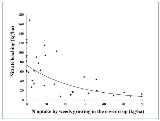 Figure 3. Nitrate leaching (kg ha–1) in legume cover crops decreased as the N content of fall weed biomass increased (kg ha–1). The equation for the regression is y = 73.8 e –0.0387x and r2 = 0.54 (p < 0.001). Data from White et al. [59].