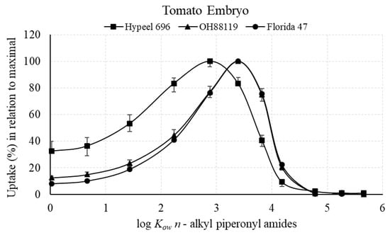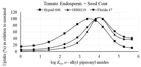 3.2.1. Maximal Uptake of Piperonyl Amides in Relation to log Kow