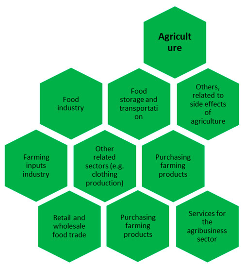 On the one hand, rural areas are natural locations for agribusiness enterprises while on the other, they are ideal places to live, work and do business [21,22,23]. This is confirmed by research on young people graduating in agriculture, agricultural technology, and certain economics majors related to the food economy [23]. These educational fields provide students with a wide range of competencies, which enables them to undertake various types of work in widely-understood agribusiness. In Poland, this sector employs more than 20% of the total workforce and generates 6.6% of the gross value added [24]. Due to its complexity, it generates employment not only in food production, processing, distribution and consumption areas but also in clothing production as well as storage and shelter space solutions [1]. The segments that are considered primary for agribusiness include agriculture (construed as the production of food resources and finished food) and the related purchasing of agricultural resources and the associated storage, transportation, and agricultural inputs industries, the food industry, fishing and forestry industries, wholesale and retail food trade, and the services related to the functioning of this entire system [25]. Each of the identified elements (subsectors) generates a separate demand for labour, which differs both in terms of employee quality (including skills) and numbers (Figure 1). These characteristics change over time and depend on such factors as the economic processes occurring in the economies of specific countries and other elements.