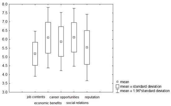 Continuing the analysis of the way gender affects the perception of characteristics of an ideal job, the subsequent part of the research included aggregating the characteristics analysed into five variables (using the arithmetic mean of the characteristics making up the variables, which are presented in Table 1). Based on the results obtained, it can be concluded that students––regardless of gender––considered social relationships (score of 6.12) and economic benefits (6.10) to be the most vital features of an ideal job, whereas the job contents was rated the lowest (5.18) (Figure 2).