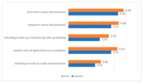 The survey further analysed the respondents’ opinions on the attractiveness of working in agribusiness (Figure 3). The results of the analyses indicate that, from the respondents’ point of view, working in agribusiness––both in the short and long term––can be an interesting career stage. Moreover, it turned out that working as a sales representative is not an attractive prospect for the respondents (despite high market demand for employees of this profession). This is true for both men and women (statistical analysis showed significant variation in scores awarded, both in terms of the mean and the median value in the case of all aspects discussed).