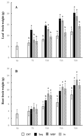 Fresh weights (g) of leaves (A) and roots (B) of strawberry plants. Error bars indicate standard deviation (n = 5). Sampling was performed at T0 (before treatments), T5 (5 days after the treatment), T10 (10 days after the treatment), T15 (15 days after the treatment), T20 (20 days after the treatment). CNT: control, Seq: sequestrene, MBF: microorganism-based formulation, In: inoculum of MBF. Values within each sampling time followed by different letters are significantly different (p < 0.05).