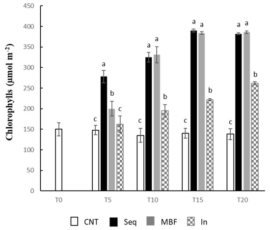 Chlorophyll content (μmoles m−2) in leaves of strawberry plants. Error bars indicate standard deviation (n = 5). Sampling was performed at T0 (before treatments), T5 (5 days after the treatment), T10 (10 days after the treatment), T15 (15 days after the treatment), T20 (20 days after the treatment). CNT: control, Seq: sequestrene, MBF: microorganism-based formulation, In: inoculum of MBF. Values within each sampling time followed by different letters are significantly different (p < 0.05).