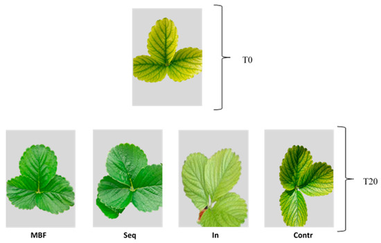 Chlorosis symptoms in leaves of strawberry plants at T0 (before treatment) and T20 (20 days after treatment).
