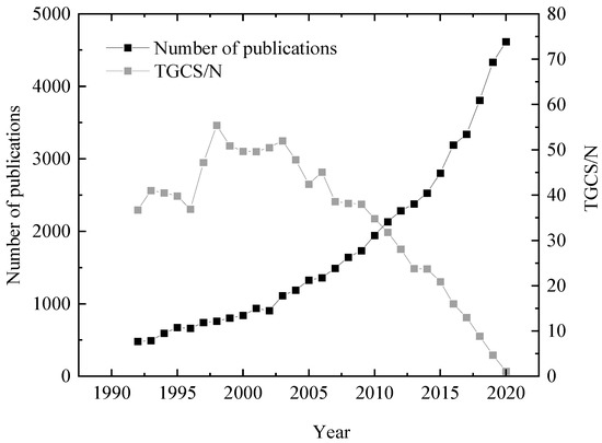 Data visualization was analyzed using software tools containing the VOSviewer 1.6.15, HistCite Pro, and CiteSpace 5.6.R3. VOSviewer, as a freely available computer program, is developed for constructing and viewing bibliometric maps, and is especially useful for displaying large bibliometric maps in an easy-to-interpret way [44]. The co-authorship of authors/organizations/countries was performed using the VOSviewer. The full counting method was used in this paper, and publications with maximum 25 authors per document were kept for analysis by default. The default settings excluded 1232 publications for analysis that exceeded 25 authors per article. HistCite Pro, a modified version based on the original HistCite, was sorted the leading status of authors/institutions/countries depending on total global citation (TGCS) and total local citations (TLCS) [45]. CiteSpace can be applied to track the development of a field closely and extensively and provide a network analysis, which is used for the treatment and presentation of results [46]. Keywords with the strongest burst citations were found using CiteSpace, which vividly showed the research topics in this field. Figures in this study were produced using VOSviewer 1.6.15, Origin 2021, and Arc GIS 10.8.