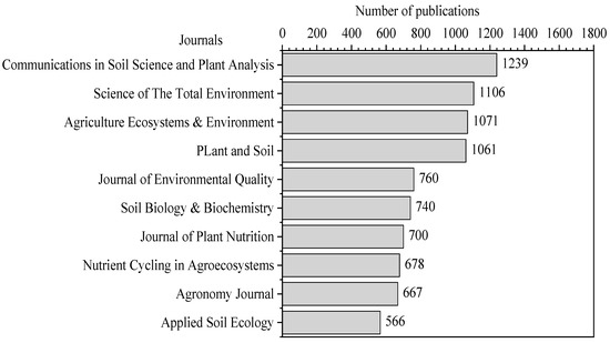 A total of 2498 journals published research on soil nutrients. The top 10 productive journals are shown in Figure 2. Communications in Soil Science and Plant Analysis (1239 publications) made the highest contributions to the total number of publications, accounting for 14.4% of total publications, followed by Science of the Total Environment (1106 publications), Agriculture Ecosystems & Environment (1071 publications), and Plant and Soil (1061 publications), each accounting for 12~13%. There were no significant differences among the other five journals, including the Journal of Environmental Quality (760 publications), Soil Biology & Biochemistry (740 publications), Journal of Plant Nutrition (700 publications), Nutrient Cycling in Agroecosystems (678 publications), and the Agronomy Journal (667 publications) in terms of the total number of publications.