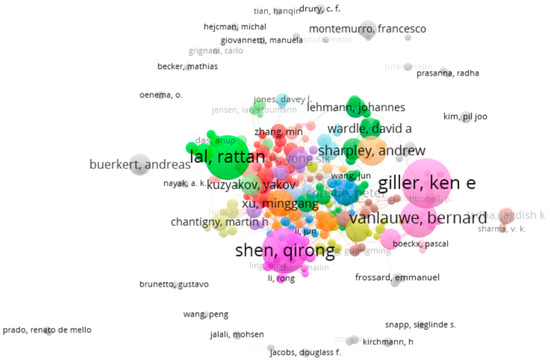 When 20 was set as the minimum number publications per author using the VOSviewer, the co-authorship network map of authors included 222 authors who had 2003 total link strength (TLS) and obtained 183 clusters closely linking with each other. However, some labels did not show due to overlap. For example, label of Christie Peter (China Agricultural University, China) in the dark blue network was overlapped by the label of Ken E Giller (Wageningen University, Netherlands) in the pink network (Figure 3). Among others, it was found Ken E Giller with 147 publications, Qirong Shen (Nanjing Agricultural University, China) with 133 publications, and Rattan Lal (Ohio State University, USA) with 131 publications were the top three productive researchers in soil nutrient field (Figure 3 and Table 2). In recent years, Ken E Giller is among the most active researcher in the topic of soil fertilizer [52,53,54]. Giller’s publications were highly cited [55], accounting for 19% of 9647 total citations (Table 2). Rattan Lal (Ohio State University, USA) has focused on surface layer of carbon and nitrogen [56], the soil-plant system [57], and the variability of soil organic matter [58]. These papers had profound influence on the soil nutrient field because of their higher citations [59,60], accounting for 42% of 11,097 total citations (Table 2). It is noteworthy that papers written by Andrew Sharpley also obtained higher citations [61,62], accounting for 39% of 11,565 total citations (Table 2). The results indicate that these highly cited papers play a very important role in soil nutrition field, and the authors (Ken E Giller, Rattan Lal, and Andrew Sharpley) play a role in advancing this field. In addition, Andrwe Sharpley and Rattan Lal are the most influential figures in the soil nutrient field due to their high total citations and citations per publication (Table 2). For instance, each publications of Andrew Sharpley was cited 132.9 times on average, which was significantly higher than others. Recently, Andrew Sharpley has been the most active researcher on topic of soil phosphorus fertilizer loss [63,64,65] and agricultural soil pollution [66], while he has not been closely linked with others. Qirong Shen ranked the first in terms of collaborating with other authors, with the greatest TLS of 846, followed by Bernard Vanlauwe (International Institute of Tropical Agriculture, Nigeria) with TLS = 545, Ken E Giller with TLS = 543, and Minggang Xu (Chinese Academy of Agricultural Sciences, China) with TLS = 513 (Figure 3 and Table 2). According to synthetic parameter of SND, Ken E Giller ranked first with SND = 2.32, followed by Rattan Lal with SND = 2.16, Qirong, Shen with SND = 2.15, and Andrew Sharpley with SND = 1.37 (Table 2). These scholars are the top influential authors in this field.