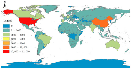 When 100 was set as the threshold of the minimum number of publications per institution or per country, institutions were grouped into 144 clusters with TLS = 11,078, and countries were grouped into 73 clusters with TLS = 28,376. The top 10 most contributing institutions in this field are shown in Table 2. It was found that the ChineseAcademy of Sciences (China), with 2579 publications, made the most contributions, followed by the USDA ARS (USA), with 1577 publications. Agr& Agri Food Canada (Canada) had 880 publications, the University of Chinese Academy Sciences (China) had 735 publications, and the University of Florida (USA) had 693 publications. The top two institutions with the greatest total publication citations were the Chinese Academy of Sciences and the USDA ARS, with 61,078 and 55,055 citations, respectively. Their citations were considerably higher than other institutions, while per article citations of the Chinese Academy of Sciences were only 23.7, ranking sixth among the top 10 institutions. In addition, the Chinese Academy of Sciences was the most active organization that was in close connection with others, as indicated by the greatest total link strength of 2069. Although the number of publications for the Swedish University of Agricultural Sciences (Sweden) and Wageningen University (Netherlands) were only 550 and 527, respectively, roughly accounting for 1.0%, their respective per article citations were 40.1 and 34.2, ranking first and third. The Chinese Academy of Sciences obtained the greatest SND of 3.00, and the USDA ARS ranked second with SND = 1.92. Their SND were much greater than other organizations, which may indicate that the Chinese Academy of Sciences and the USDA ARS are the most impactful organizations in this field.