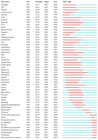 Keyword burst detection in the documents was analyzed by the CiteSpace to illustrate research hot spots in a specific period. The red dotted lines in Figure 5 are heat bars, representing the time period with the strongest citation bursts [67]. Hot topics of soil nutrient field could be divided into three stages: (1) The topic of soil nitrogen (with keywords of nitrate, N15, denitrification, nitrogen fixation, ammonium, and aluminum) and crop (corn, tree and legume) became a research hot spot between 1992 and 2009. During this period, there were many theoretical studies on soil nutrition [68,69,70,71]. The relationships between soil fertilizers and plants were also gradually studied by scholars [72,73,74]. (2) The research directions were then gradually shifted to focus on soil pollution (with keywords of loss, litter, and population), forest (e.g., agroforestry, forest soil, and deforestation), and farmland manure (e.g., cattle slurry and broiler litter). The hot study region and climate was West Africa and Savanna, respectively. Scholars were interested in the research of maintaining soil fertility in West Africa [75,76], likely with the goal of improving the environment and the inherent poor soil fertility in West Africa [76], which could increase crop yield and reduce starvation and malnutrition [77,78]. (3) Between 2015 and 2020, soil health (including charcoal, biochar, and physicochemical property) and ecosystem service (e.g., biochar, physicochemical property, greenhouse gas emission, and pyrolysis temperature) became the hot research topics due to the increased concern on agricultural sustainability with the goal of food security. Our analysis indicated that soil nitrogen fertilizer, soil pollution, and soil health are of great importance in soil nutrient field. Scholars have tried to find the best solutions for soil pollution, using farmyard manure, bacteria, and biochar to remediate/reclaim soil properties [79,80,81]. These papers included topics of nitrogen fertilizer [61], nitrate [82], green manure [83], nitrogen loss [84], biochar [85], and microbial communities [86], which obtained higher citations. Biochar can impact soil biota [85], and microorganisms play a regulating role in soil nutrition [87,88,89], as they have reinforced soil nutrition health [90,91]. Therefore, these themes of nitrogen fertilizer, green manure, biochar, and microbial communities have been favored by authors. The soil remediation of biochar may become a breakthrough in the management of soil nutrients, as it had highest strength burst (Figure 5).