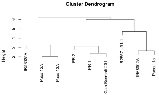 The current investigation evaluated the yield-component characteristics of nine aromatic parental lines, along with their 20 F1 hybrid combinations under normal and water-stress conditions. The assessment of the genetic variation between the CMS and restorer lines is highly requisite for the efficient use of heterosis breeding. In this study, the UPGMA cluster analysis revealed that there was a high diversity difference between the CMS and restorer lines (Figure 1). This wide diversity can lead to the development of super heterotic hybrid Rice [18,19,20]. Our study revealed that all traits were significantly affected by water deficit compared with normal irrigation conditions (Table S1).