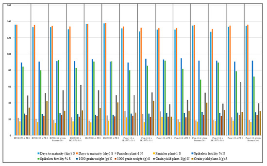 The hybrid Pusa12A/Giza-Basmati-201 had the highest SCA for the GY despite both of its parents having a negative GCA for that trait under both normal and water-stress conditions (Table 4). In contrast, the hybrid IR58025A × IR25571-31-1 exhibited negative SCA effects despite both of its parents having a good GCA for the GY under normal and water-stress conditions. Such results are possible due to complex combinations and interactions among the positive and negative alleles of the genes of the parents. Similar findings were also found in previous studies [14,15,16,17,18,19,20,21,22,23,24,25,26,27,28,29,30,31,32,33,34,35,36,37,38,39,40,41,42,43,44,45,46,47,48,49,50,51,52,53,54,55].