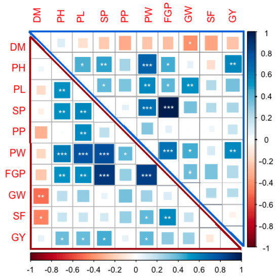 Corrplot depicting Pearson’s correlation between 10 yield traits across 29 genotypes under normal (upper triangle) and water-stress (lower triangle) conditions. Red squares indicate a negative correlation; blue squares indicate a positive correlation; and white squares indicate no correlation. The asterisks indicate significant correlations using a two-tailed t-test (* and ** p < 0.05; and *** p < 0.01).