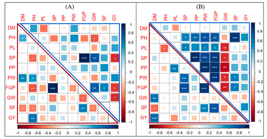 Corrplot depicting Pearson’s correlation between the general and specific combining ability for 10 yield traits across 29 genotypes. Red squares indicate a negative correlation; blue squares indicate a positive correlation; and white squares indicate no correlation. (A) GCAs (upper triangle) and SCAs (lower triangle) under normal growth conditions. (B) GCAs (upper triangle) and SCAs (lower triangle) under water-stress conditions. The asterisks indicate significant correlations using a two-tailed t-test (* and ** p < 0.05; and *** p < 0.01).