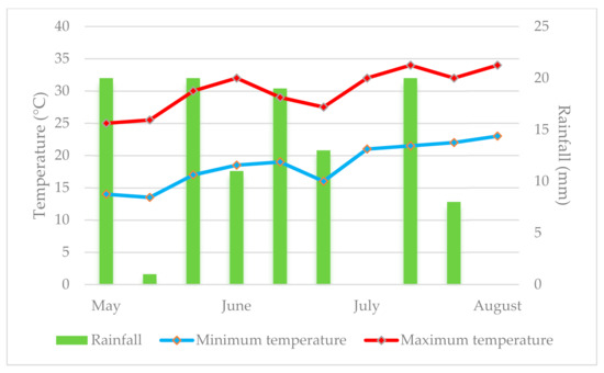 This research was carried out in 2018 in Tavoliere delle Puglie (Foggia, southern Italy) on tomato, in order to assess the effects of processing on the product yield and quality of four round-prismatic tomato hybrids addressed to diced production. The experiment was conducted on a silty sand textured soil with 2% organic matter, 1.3 g·kg−1 N, 38 mg·kg−1 P2O5 and 95 mg·kg−1 K2O. The time course of temperature and rainfall are shown in Figure 1. The tomato hybrids compared were: HMX 4228 (HM.Clause Italia), Max 14111 (Syngenta Italia S.p.A.), UG 16112 (United Genetics Italia S.p.A.), Impact (ISI Sementi).