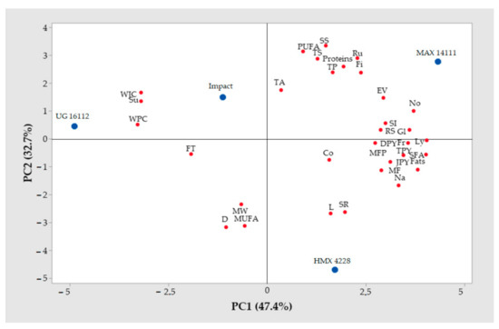 Figure 2. Biplot graph relevant to Principal Component Analysis (PCA). HMX 4228, Max 14111, UG 16112 and Impact are the four hybrids tested (blue circles). The variables examined (red circles) are: Co, color; D, fruit diameter; DPY, diced processing yield; EV, energetic value; Fi, fiber; Fr, fructose; FT, flesh thickness; Gl, glucose; JPY, juice processing yield; L, fruit length; Ly, lycopene; MUFA, monounsaturated fatty acids; MW, mean fruit weight; MF, marketable yield; MYP, marketable yield percentage; Na, naringenin; No, number of fruits per plant; PUFA, polyunsaturated fatty acids; RS, reducing sugars; Ru, rutin; SFA, saturated fatty acids; SI, shape index; SR, sugar ratio; SS, soluble solids; Su, sucrose; TA, titratable acidity; TP, total polyphenols; TPY, total processing yield; TS, total solids; WPC, waste along peeling chain; WJC, waste along juice chain.