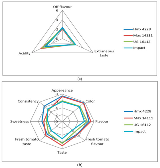 Figure 3. Organoleptic evaluations of diced tomato fruits: (a) Sensorial profiles of the undesired features, named negative. (b) Sensorial profiles of the desired features, named positive.
